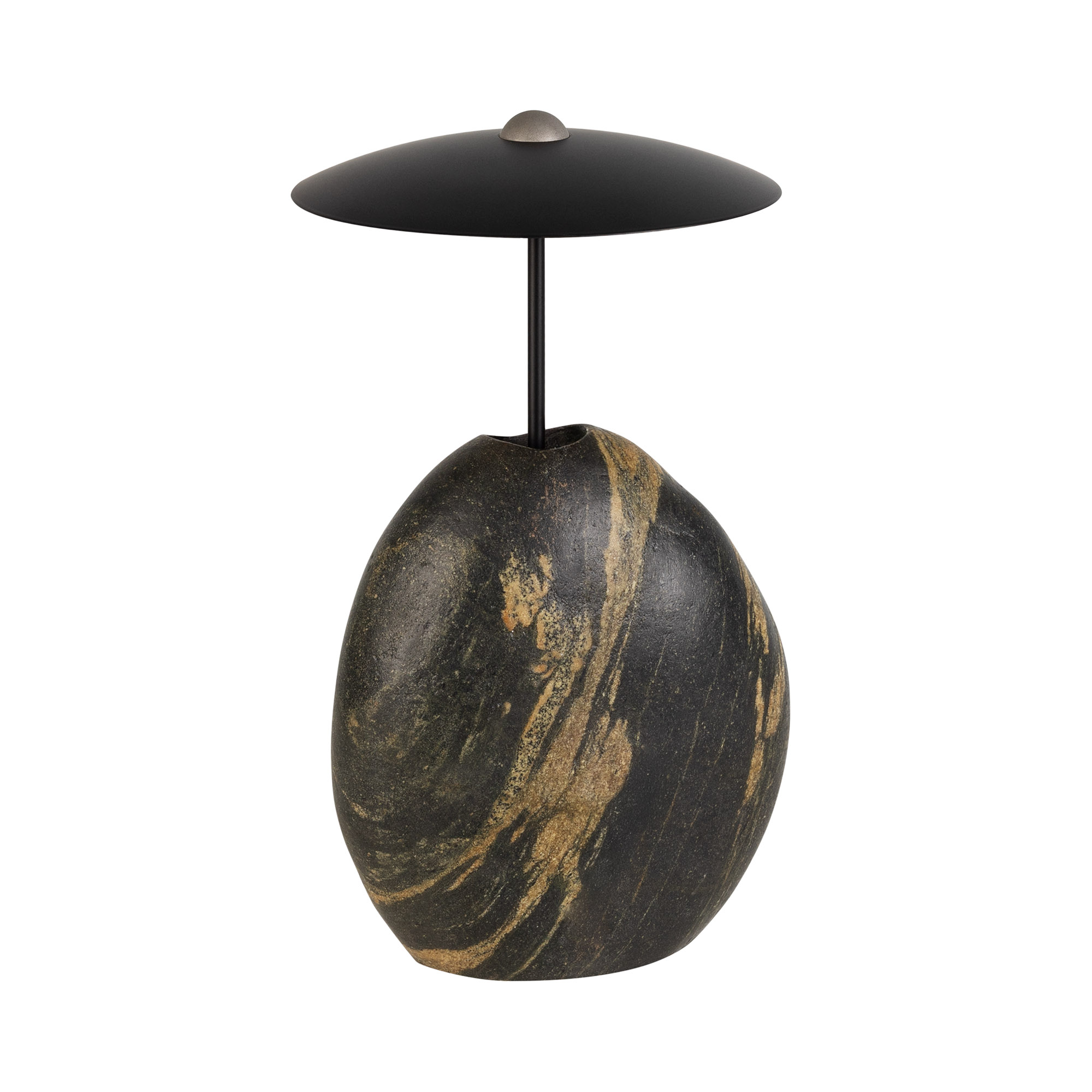 Настольный светильник UMANI. Мощность 6 Вт, св. поток 10,4 лм, 2 лм/Вт, теплый 2700К, CRI>92, угол 90°, напряжение питания 230 В. Черный рессеиватель из металла. Основание светильника выполнено из натурального камня, каждый экземпляр уникален своей неповторимой формой и текстурой. Степень защиты IP20. Диаметр рассеивателя: 250 мм. Общая высота: 340 мм. Высота основания: 190 - 230 мм. Диаметр основания: 160 - 200 мм. Длина кабеля 2м. Пульсация <5%.